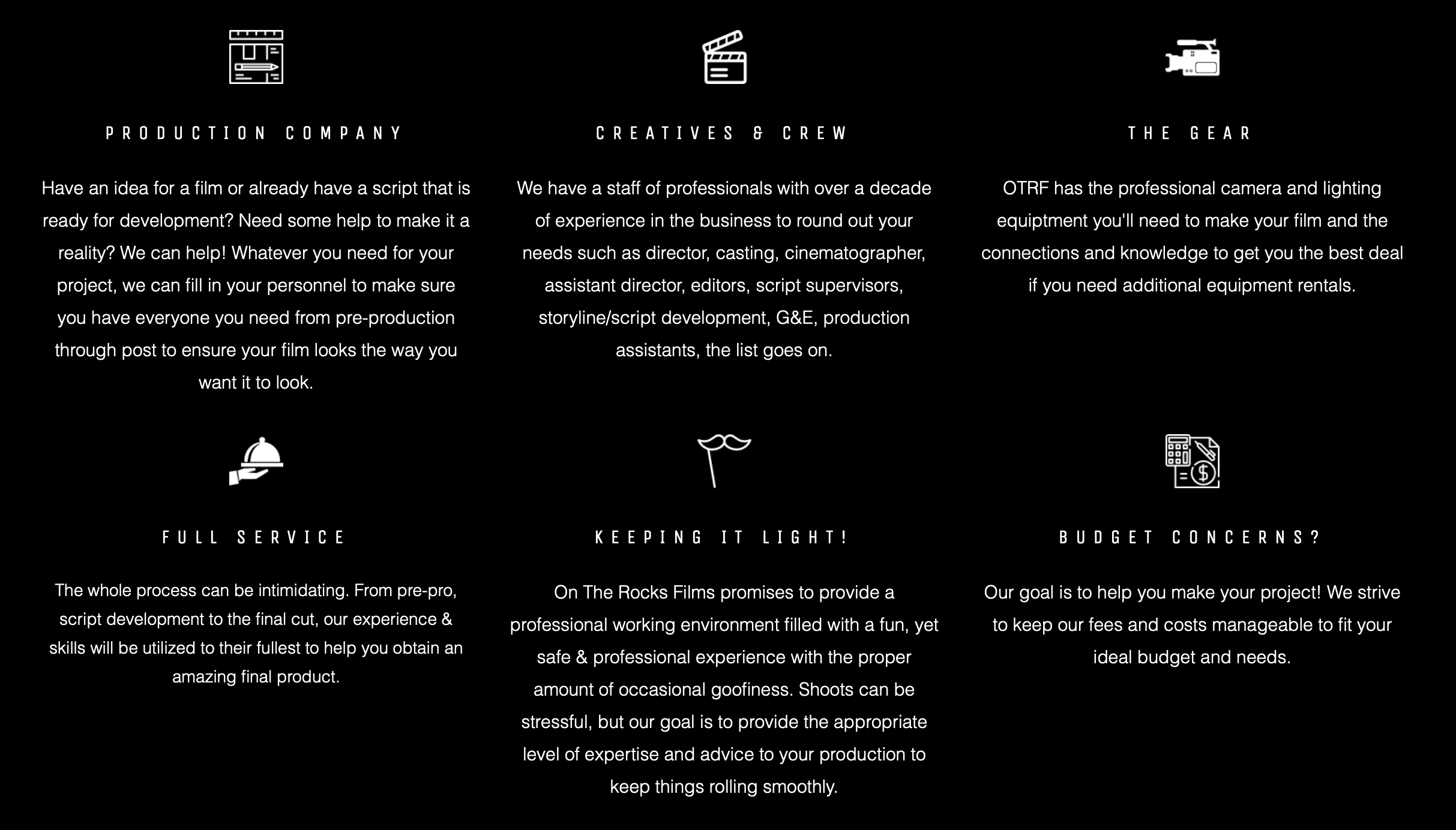 Based on the scope of your project and needs, OTRF promises to keep things moving at a professional pace with optimal quality content captured. We have a whole roster of professionally skilled crew and creatives we can recommend for hire or build into our package with you.